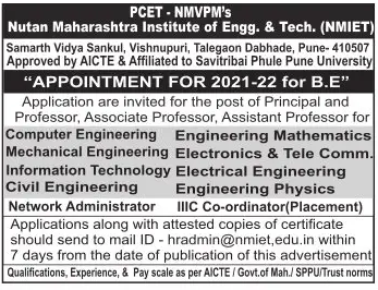 Faculty Recruitment 2021 notification announced by Nutan Maharashtra Institute of Engineering and Technology , Maharashtra wanted Professor/ Associate Professor and Assistant Professor Jobs. Eligible...