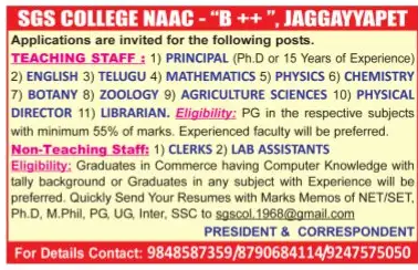 Sreemathi Gentela Sakuntalamma college, Jaggayyapeta, Andhra Pradesh wanted Teaching Staff Jobs for 2021-2022 academic year. Eligible candidates may apply through Email.