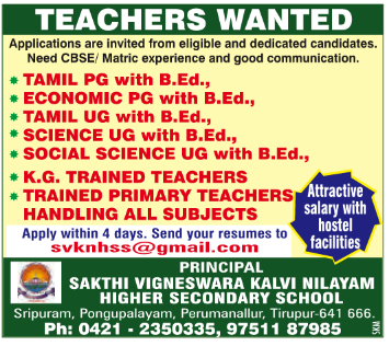 Sakthi Vigneswara Kalvi Nilayam, Tirupur Wanted Female Teachers