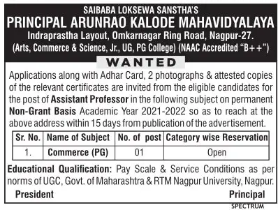 SLS Principal Arunrao Kalode Mahavidyalaya, Nagpur Wanted Assistant Professor
