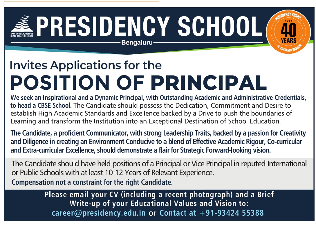 Presidency School, Bengaluru, Wanted Principal