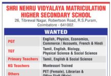 Shri Nehru Vidyalaya Matriculation Higher Secondary School, Coimbatore Wanted PGT/TGT/Primary/KG Teachers and Non-Teaching Staff