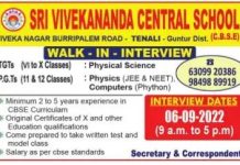 Faculty recruitment notification announced by Sri Vivekananda Central School, Guntur for the post of TGT/PGT Teachers. Eligible candidates may appear for a walk-in interview.