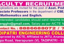 Faculty recruitment notification announced by Tadipatri engineering College, Tadipatri for the post of Associate Professors/ Assistant Professors. Eligible candidates may apply by email.