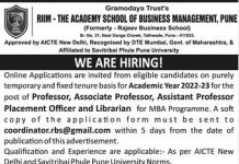 RIIM The Academy School of Business Management, Pune, Maharashtra has advertised for the faculty recruitment for the post of Assistant Professor, Associate Professor, Professor Jobs....