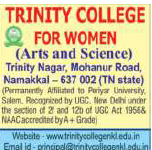 Teaching Jobs vacancy notification announced by Trinity College For Women, Namakkal, Tamilnadu for the 2022-2023 calendar year. Eligible candidates may apply by email/ postal.