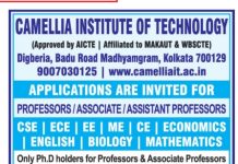 Faculty Recruitment job notification announced by Camellia Institute of Technology, Kolkata for the post of Assistant Professor/ Associate Professor/ Professor/ Visiting/ Adjunct Professors, Training...