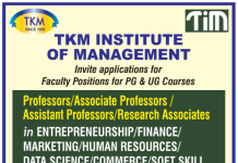 TKM Institute of Management, Kollam wanted Professors/Associate Professors / Assistant Professors/Research Associates for the academic year 2023-2024. Eligible candidates can apply by Email.