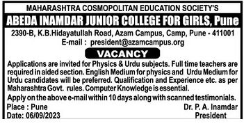 Faculty recruitment 2023 Job vacancy notification announced by Abeda Inamdar Junior College for Girls, Pune for the post of Teaching Faculty for the 2023-2024 academic year. Eligible candidates may apply by email within 10 days from the date of advertisement.