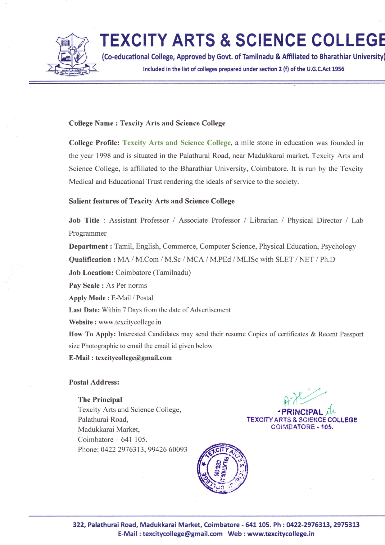 Academic and administrative careers are now open at Texcity Arts and Science College, Coimbatore – rewarding openings in Tamil, English, Commerce, Computer Science, Physical Education, and Psychology. The institution invites applications for the posts of Assistant Professor, Associate Professor, Librarian, Physical Director, and Lab Programmer. Qualified candidates with strong academic credentials and passion for teaching are encouraged to apply through email or postal mode within 7 days from the date of advertisement.