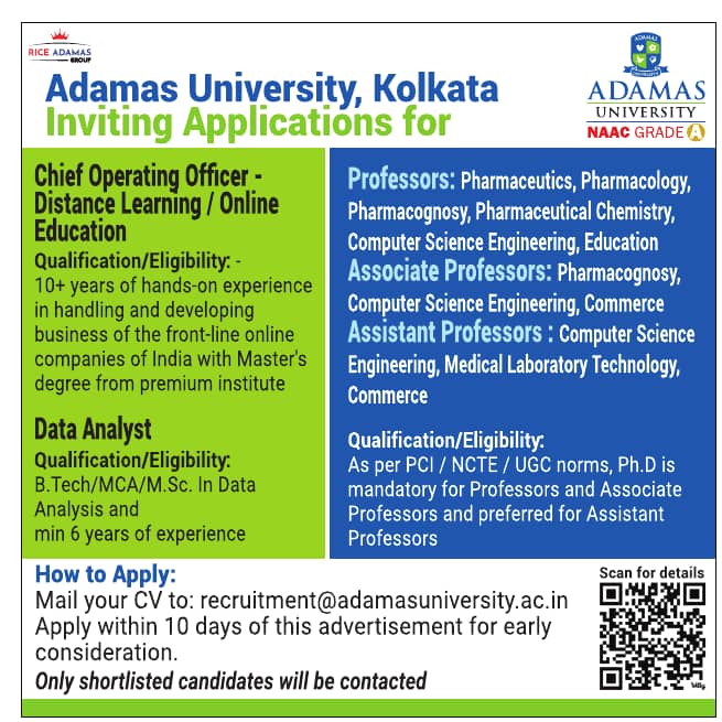 College Profile: Adamas University offers a challenging, meaningful work in an open environment that celebrates diversity in all its forms. Being part of Adamas University is more than just a career –it could be a life-changing experience. The University invites applications from Indian Nationals who are exceptionally bright and motivated with an established record of excellence, independent high-quality research, and commitment to teaching for the following position.