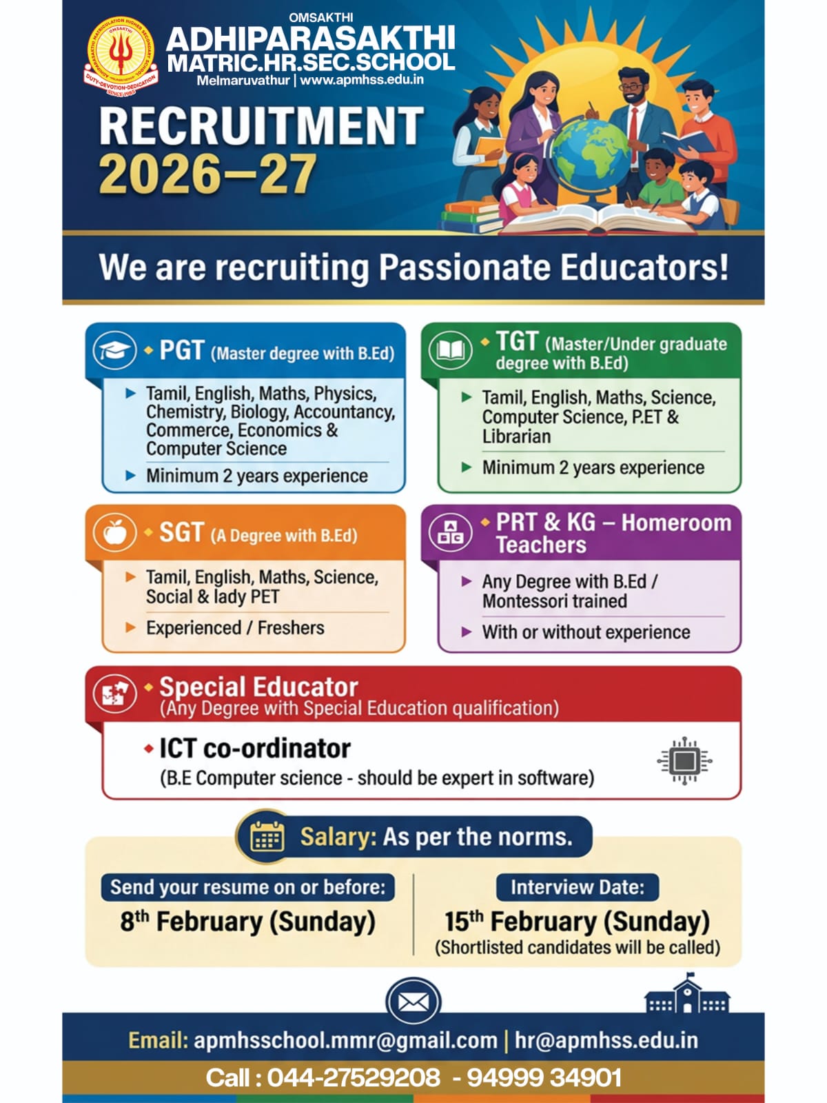 Adhiparasakthi Matric HR Sec School Recruitment 2026–27, teaching jobs in Melmaruvathur, PGT, TGT, SGT, PRT, KG Teachers, Special Educator, ICT Coordinator vacancies, school faculty recruitment Tamil Nadu, apply by email.