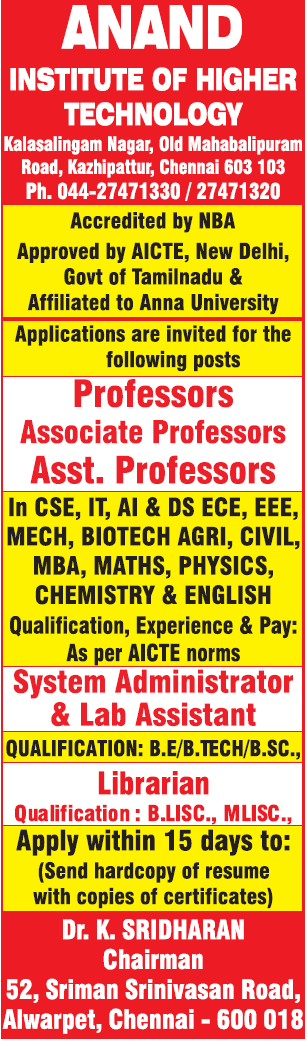 Teaching Faculty Recruitment job notification announced by Anand Institute of Higher Technology, Chennai , Tamilnadu for the post of Professor, Associate Professor, Assistant Professor, Non-Teaching jobs. Interested candidates may apply through post.