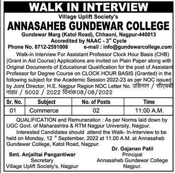 Faculty Recruitment job notification announced by Annasaheb Gundewar College, Nagpur, Maharashtra for the post of Assistant Professor Jobs. Eligible candidates may appear for walk-in.