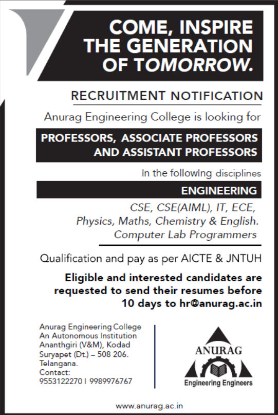 Anurag Engineering College, Suryapet Wanted Professor/Associate Professor/Assistant Professor