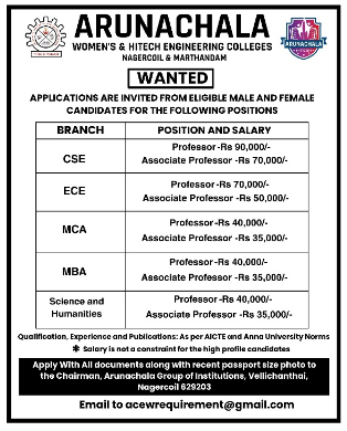 Hiring Organization: Arunachala College of Engineering for Women, Kanyakumari, Tamilnadu