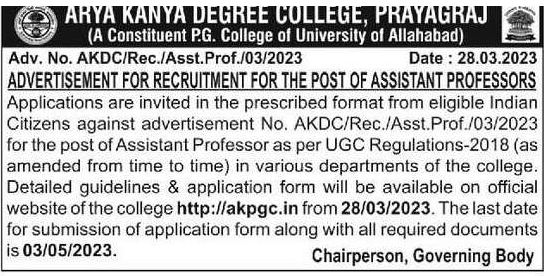 Arya Kanya Degree College, Prayagraj wanted Assistant Professor for 2022-2023 academic year. Eligible candidates may apply through Postal