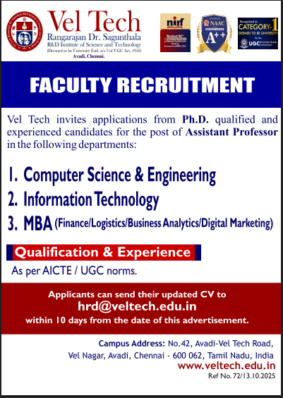 Faculty recruitment Job vacancy notification announced by Vel Tech Rangarajan Dr. Sakunthala R&D Institute of Science and Technology Chennai, Tamil Nadu for the academic year 2025-2026. Eligible candidates may apply through Email.