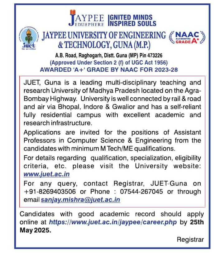 Jaypee University of Engineering & Technology, Guna, Madhya Pradesh advertised for Faculty jobs 2025-2026 – Assistant Professor Jobs. Eligible candidates can apply online.
