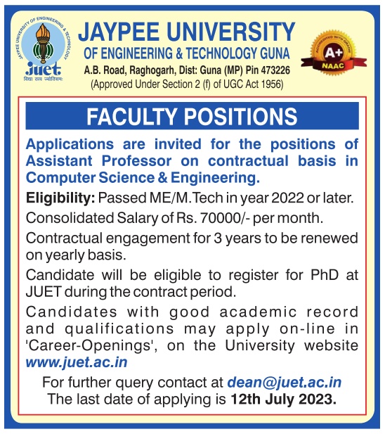Jaypee University of Engineering & Technology, Guna, Madhya Pradesh advertised for Faculty jobs 2023 – Assistant Professor Jobs. Eligible candidates can apply.