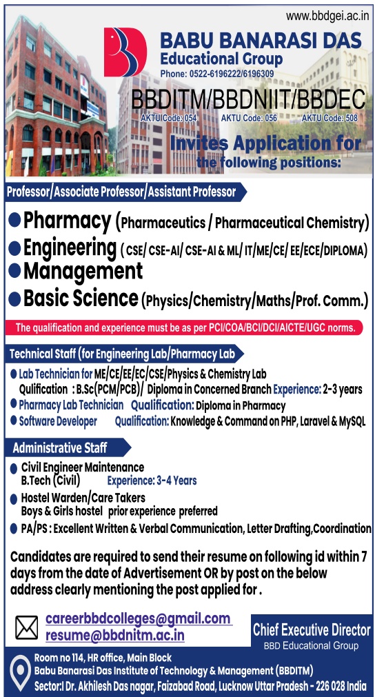 Faculty Recruitment job notification announced by Babu Banarasi Das Educational Group, Lucknow, Uttar Pradesh for the post of Professor, Assistant Professor, Associate Professor Jobs. Eligible candidates may apply within 7 days.