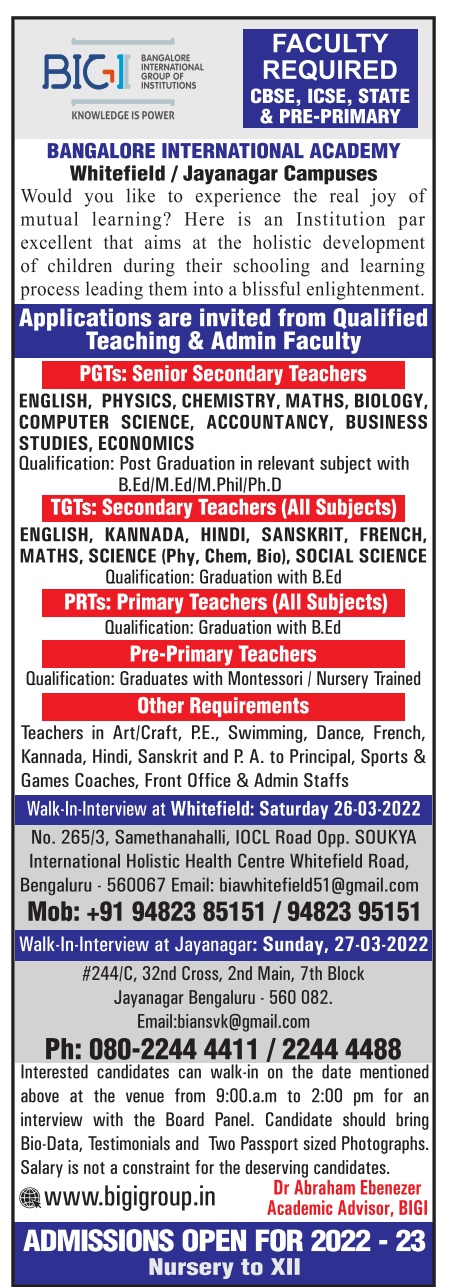 Faculty Recruitment job notification announced by Bangalore International Academy, Bangalore for the post of PGT/TGT/PRT/Pre Primary Teacher, P.A. to Principal, Sports and Games Coaches, Front Office & Admin Staffs. Eligible candidates may appear for a walk-in interview.