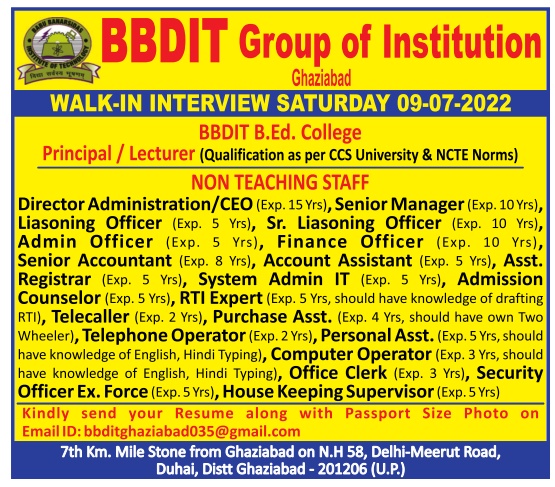 Faculty Recruitment job notification announced by BBDIT Group of Institution, Ghaziabad for the post of Principal / Lecturer, Director, Administration/CEO, Senior Manager, Liasoning Officer, Sr. Liasoning Officer, Admin Officer, Finance Officer, Senior Accountant, Account Assistant, Asst.Registrar, System Admin IT, Admission Counselor, RTI Expert, Telecaller, Purchase Asst., Telephone Operator, Personal Asst. Computer Operator, English, Hindi Typing), Office Clerk, Security Officer Ex. Force, House Keeping Supervisor. Eligible candidates may apply through email.