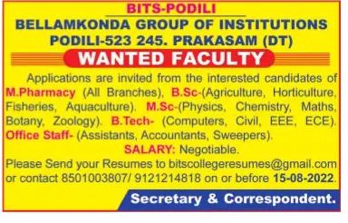 Faculty Recruitment job notification announced by Bellamkonda Group of Institutions, Prakasam, Andhra Pradesh for the post of Teaching Faculty Jobs. Eligible candidates may apply by email.
