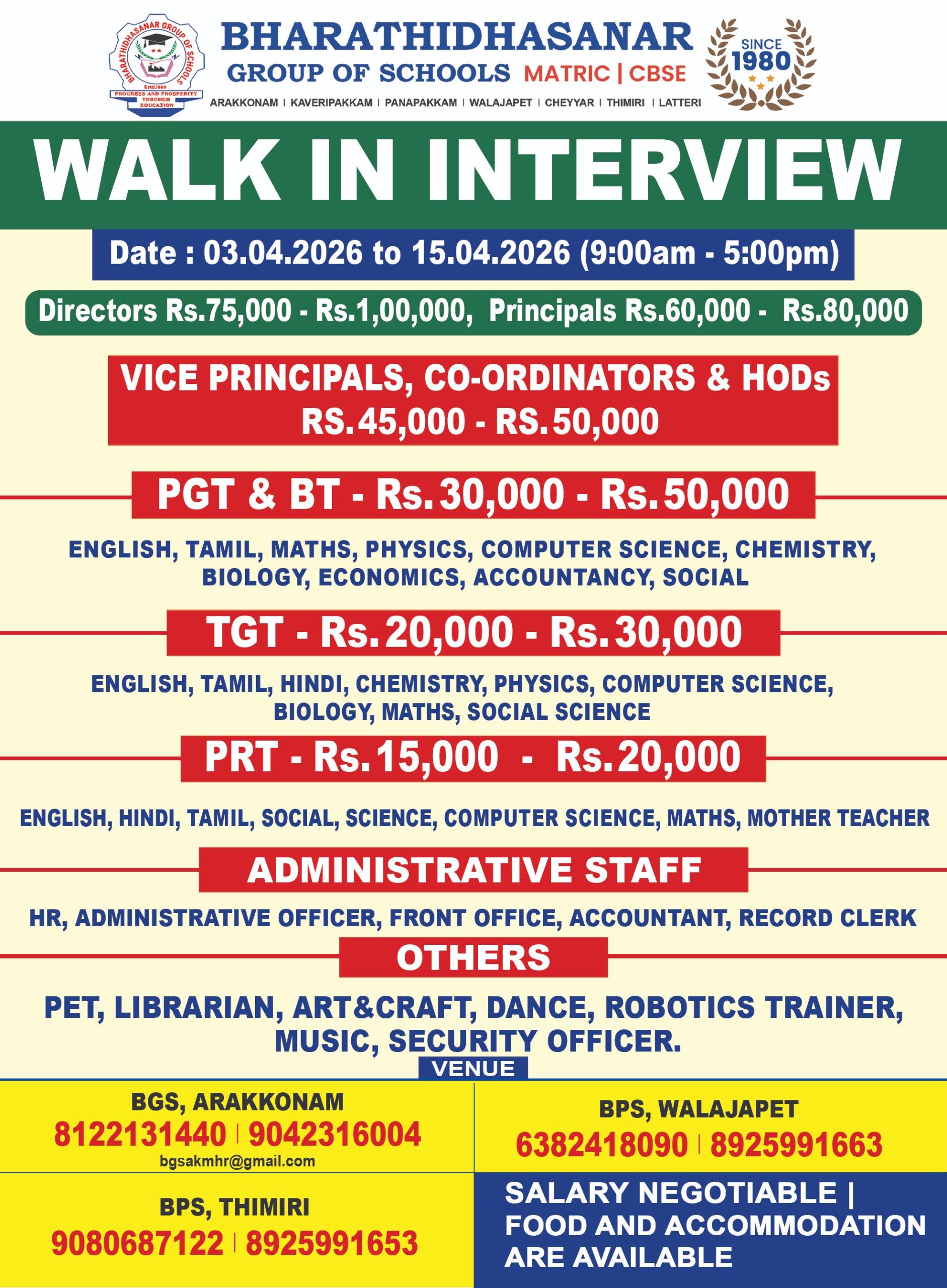 Bharathidhasanar Group of Schools (Matric, CBSE)- Walk-in Interview