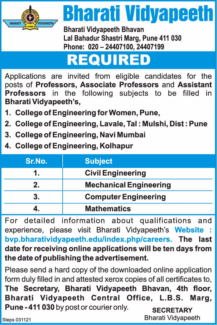 Bharati Vidyapeeth , Pune Wanted Professor/Associate & Assistant Professor