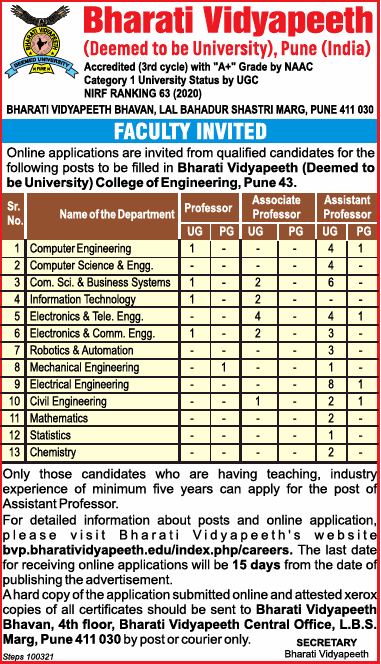 Bharati Vidyapeeth , Pune Wanted Professor/Associate & Assistant Professor