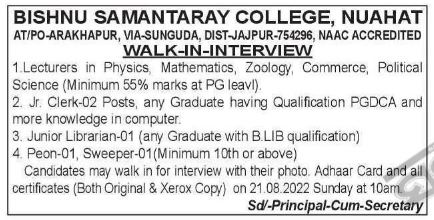 Faculty Recruitment job notification announced by Bishnu Samantaray College, Nuahat, Odisha for the post of Lecturer, Non-Teaching Jobs. Eligible candidates may appear for walk-in.
