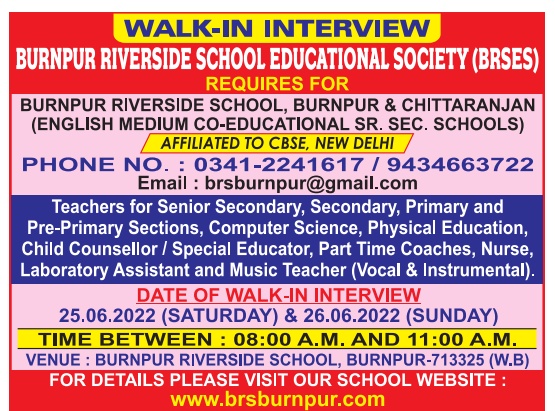 Faculty Recruitment job notification announced by Burnpur Riverside School Educational Society, Burnpur for the post of Teachers for Senior Secondary, Secondary, Primary, Pre Primary, Special Educator, Part time coaches. Eligible candidates may appear for a Walk-in interview.