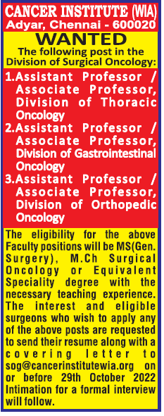 Job notification 2022 announced by The Cancer Institute (WIA), Adyar, Chennai for the academic year of 2022-2023 for the post of Assistant Professor / Associate Professor. for more details see below.