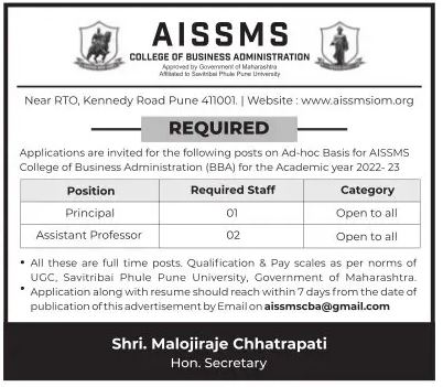 Teaching Faculty Recruitment job notification announced by Carmel Vidya Bhavan Trust’s Christ College, Pune for the post of Principal and Assistant Professor jobs. Interested candidates may apply by post.