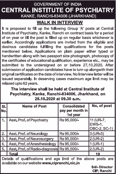 Central Institute of Psychiatry, Ranchi Wanted Tutor
