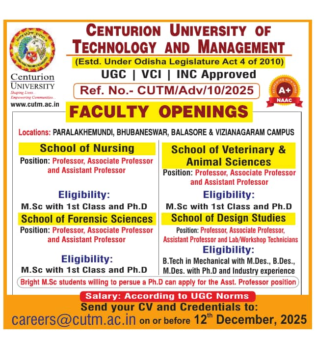 Faculty recruitment 2025 Job vacancy notification announced by the Centurion University of Technology and Management, Odisha – Assistant Professor/ Associate Professor/ Professor Jobs for the 2025-2026 academic year. Eligible candidates may apply by email