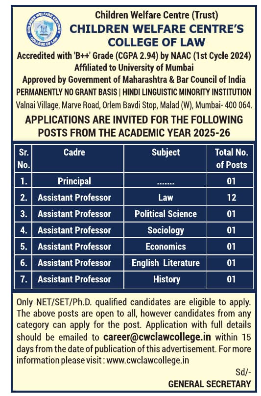 Faculty recruitment 2025 job notification announced by Children Welfare Centre’s College of Law, Mumbai for the Post of Principal and Assistant Professor jobs. Interested candidates may apply by email within 15 days from the date of advertisement.