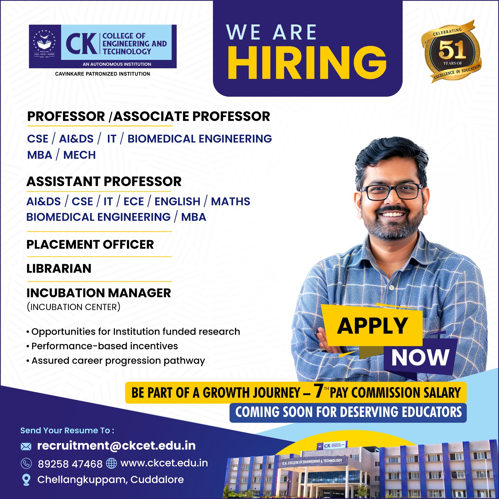 Experience: Prior Teaching experience in reputed Engineering Colleges is preferred / Freshers can also apply for Assistant Professor vacancy.