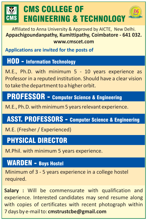Faculty Recruitment job notification announced by CMS College of Engineering & Technology, Coimbatore for the post of Professor/Assistant Professor/Physical Director and Others. Eligible candidates may apply by email.