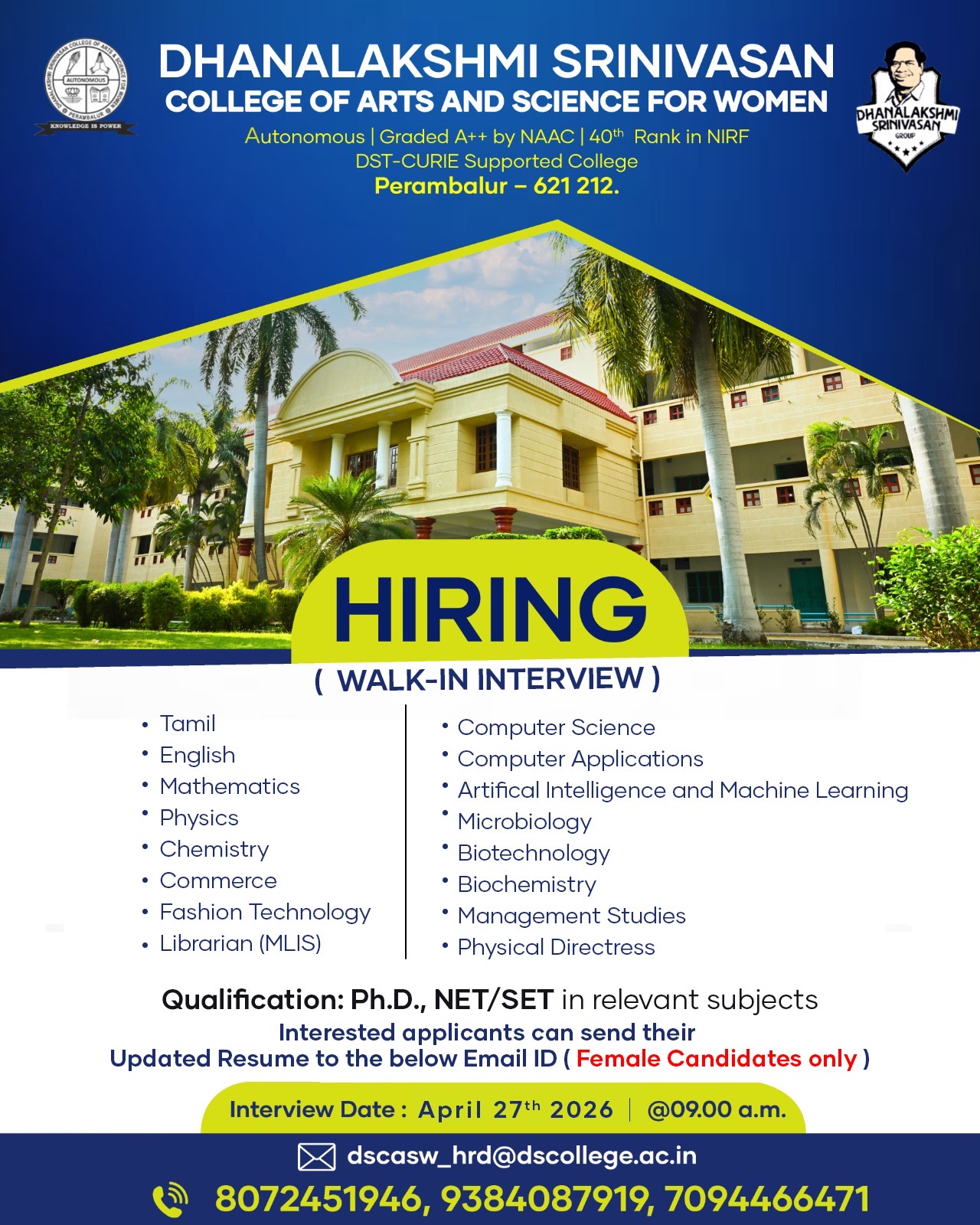 Dhanalakshmi Srinivasan College of Arts and Science for Women, Perambalur has released a recruitment notification for faculty positions for the academic year 2026. The institution is organizing walk-in interviews to appoint qualified female candidates across various disciplines. This opportunity is well-suited for individuals who are dedicated to teaching, research, and academic excellence, and who aspire to contribute to a reputed institution focused on women’s education and empowerment.
