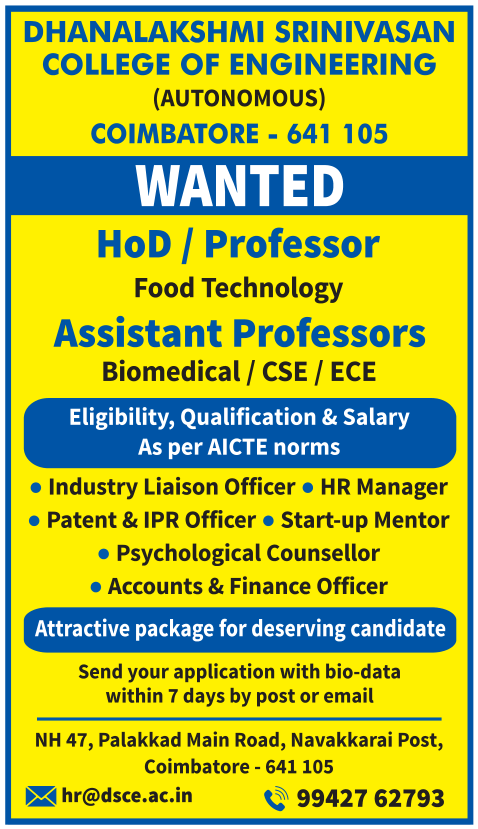 Teaching job vacancy notification announced by Dhanalakshmi Srinivasan College of Engineering(Autonomous),Coimbatore, Tamilnadu. Eligible candidates may apply through Email/ Postal.