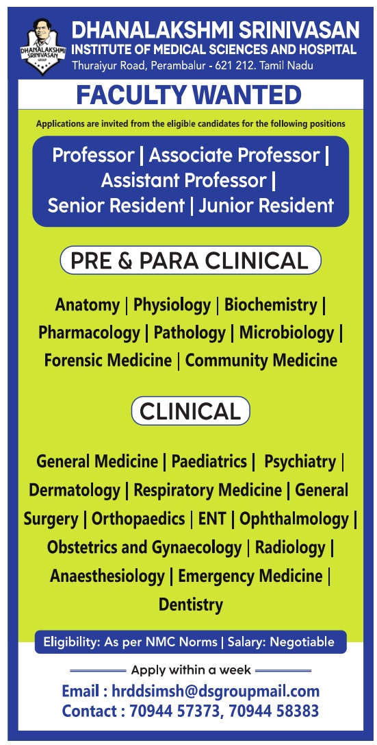 Dhanalakshmi Srinivasan Institute of Medical Sciences and Hospital, Perambalur Wanted Professors/Associate Professors/ Assistant Professors/ Senior Resident