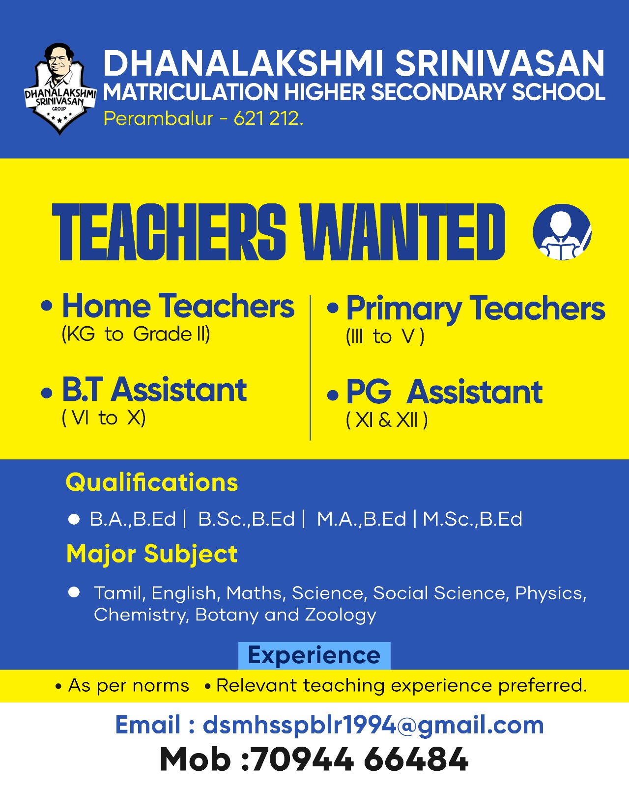 Hiring Organization: Dhanalakshmi Srinivasan Matriculation Higher Secondary School