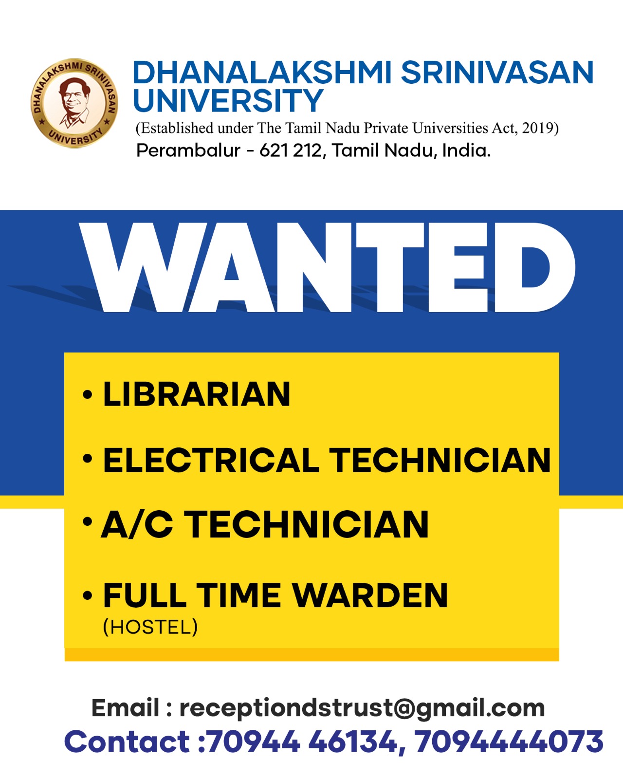 Job Location: Dhanalakshmi Srinivasan University, Perambalur, Tamil Nadu