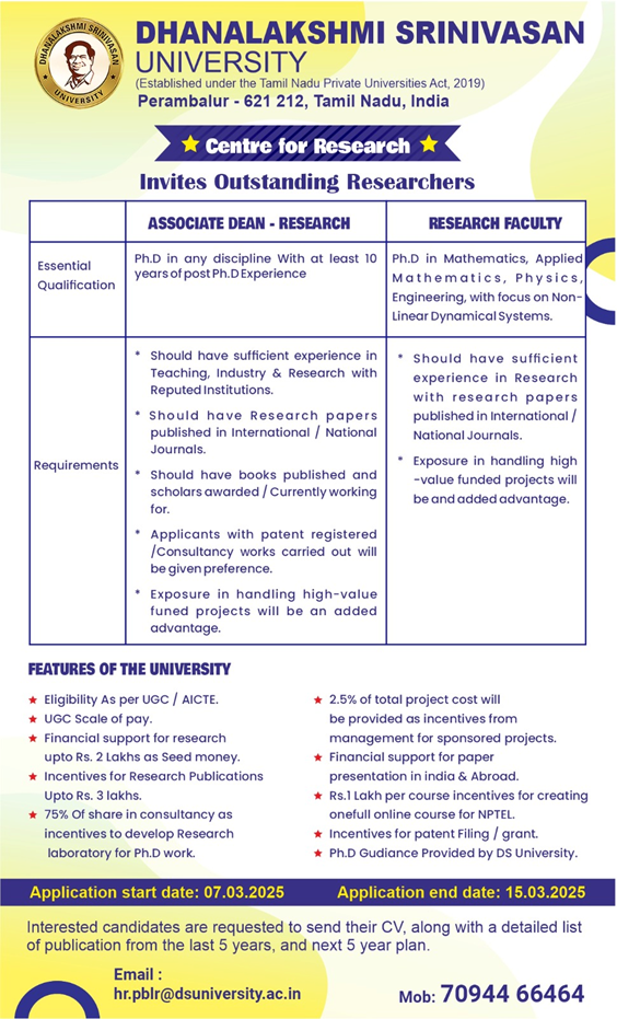 Dhanalakshmi Srinivasan University, Perambalur Wanted Outstanding Researchers