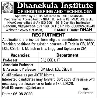 Teaching Faculty Recruitment job notification announced by Dhanekula Institute of Engineering and Technology, Vijayawada, Andhra Pradesh for the post of Professor, Associate Professor, Assistant Professor, Non-Teaching jobs. Interested candidates may apply by email.