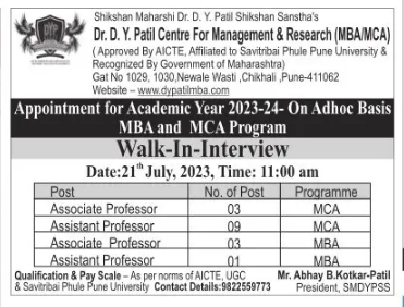 Faculty recruitment notification announced by Dr. D. Y. Patil Centre for Management & Research, Pune for the 2023-2024 academic calendar year for the post of Associate Professor/ Assistant Professor jobs. Eligible candidates may walk-in on 21st July 2023 at 11.00 am.