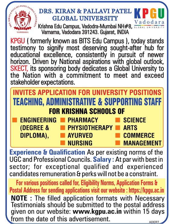 Faculty Recruitment job notification announced by DRS.Kiran and Pallavi Patel Global University, Vadodara, Gujarat for the post of Associate Professor, Assistant Professor, Professor Jobs. Eligible candidates may apply by Postal.