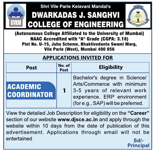 Non-Teaching Jobs vacancy notification announced by Dwarkadas Jivanlal Sanghvi College of Engineering, Mumbai wanted Academic Coordinator for the 2025-2026 academic calendar year. Eligible candidates may apply through Online